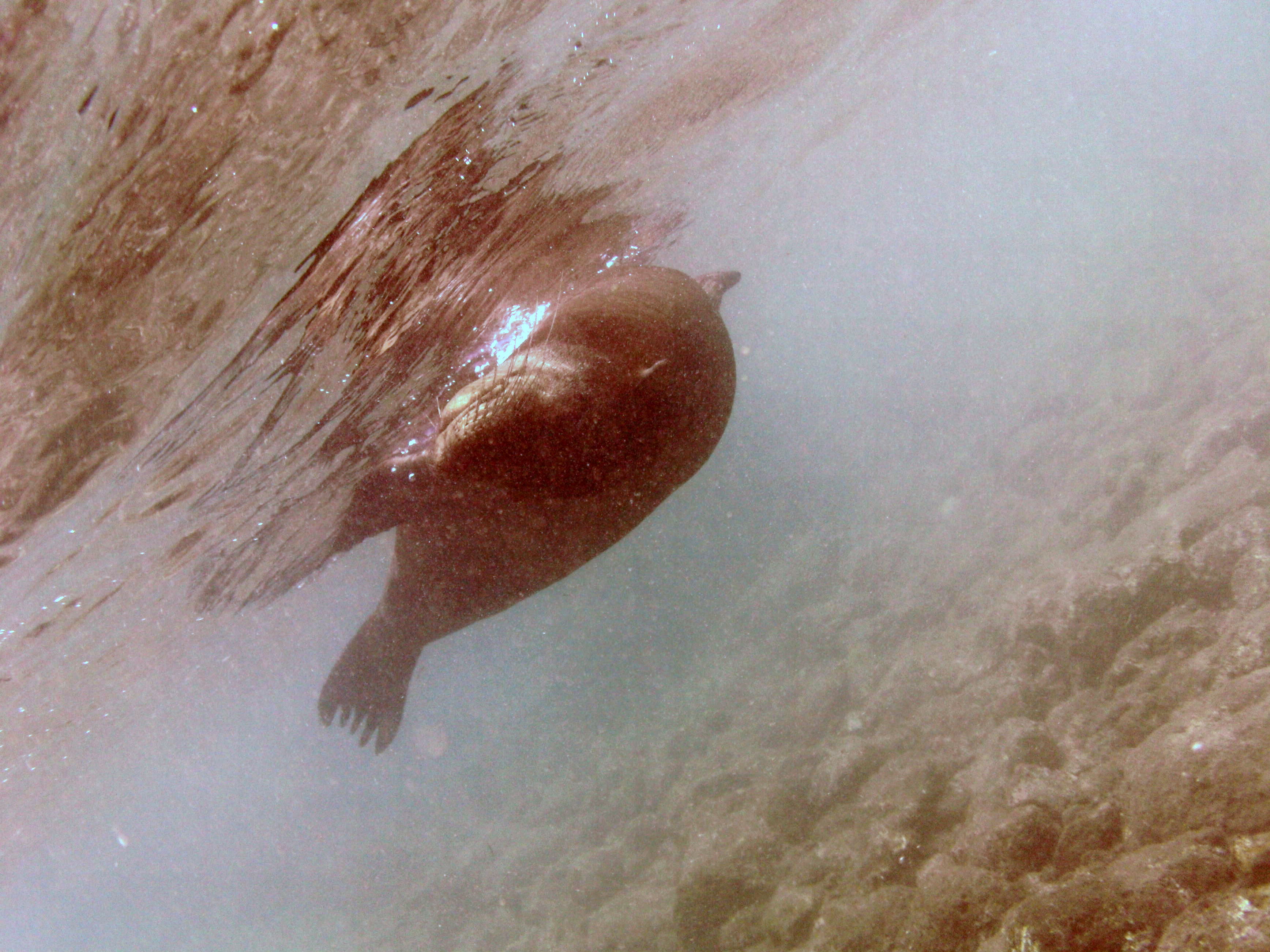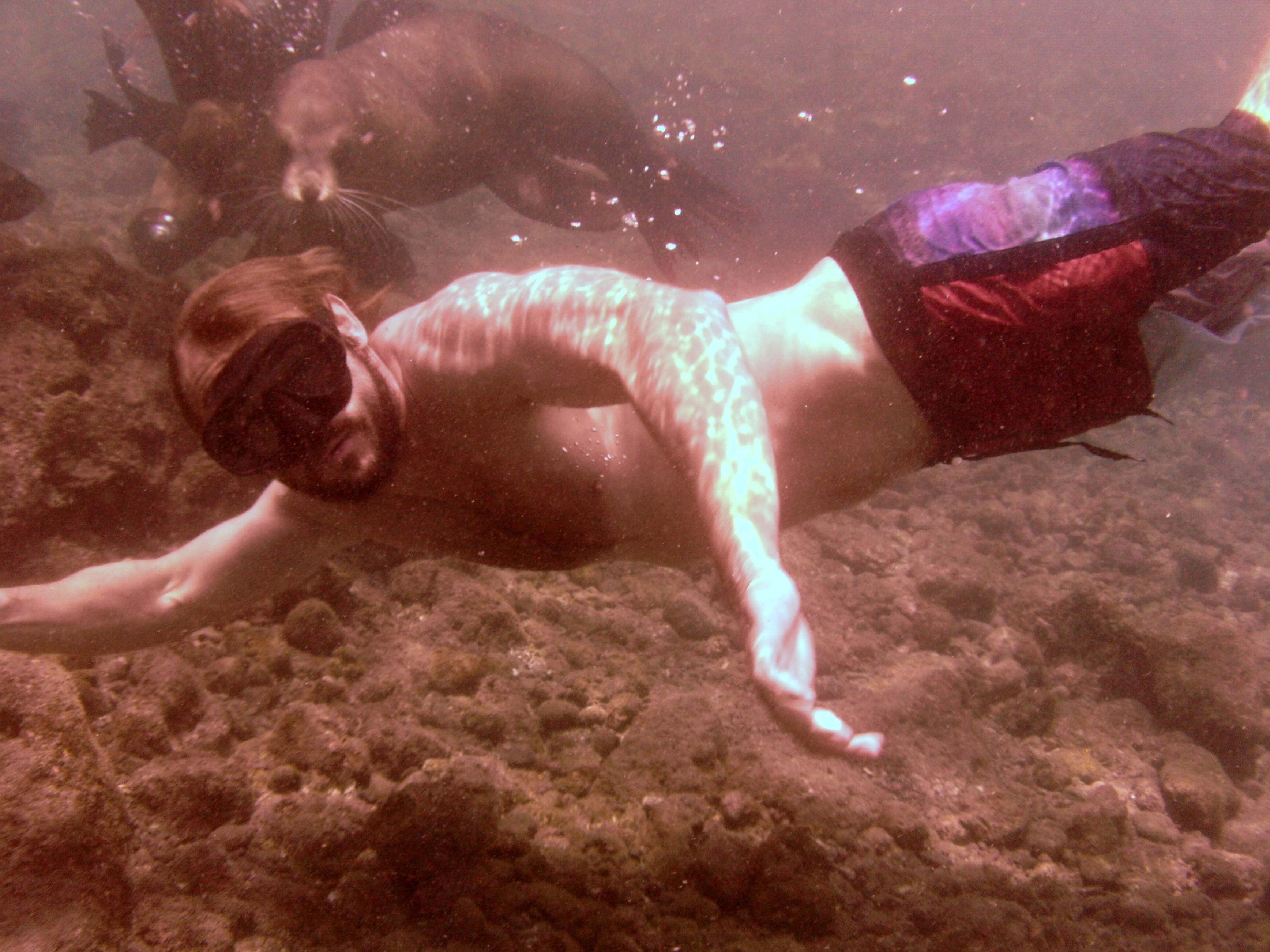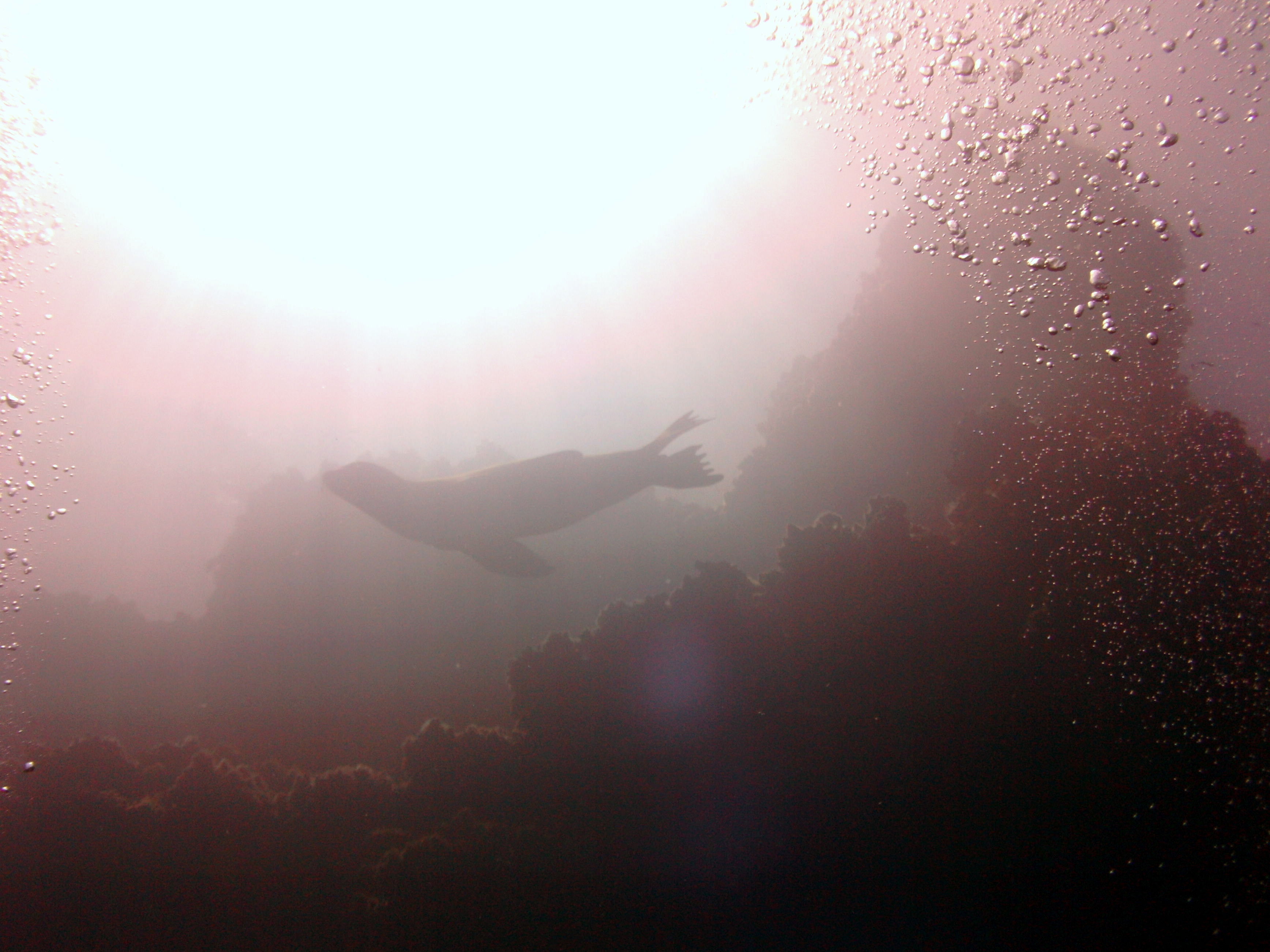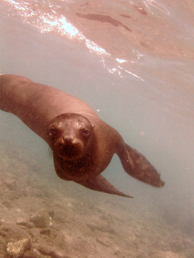 There was a bright blue lagoon near the rocks and I saw the occasional head or flipper break the surface and then disappear. There were sea lions in the water. “Can we swim with them?” I asked as I grabbed my mask. “Yes, but just don’t touch them.” replied the dive master. Before he had finished the sentence I was frantically scrambling over the side of the boat with my mask in hand. I was in a near state of panic as I ungracefully flopped into the refreshing water creating a massive splash. Every second that I was not swimming with the sea lions was a personal tragedy.
