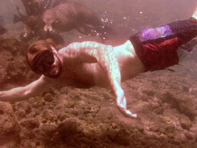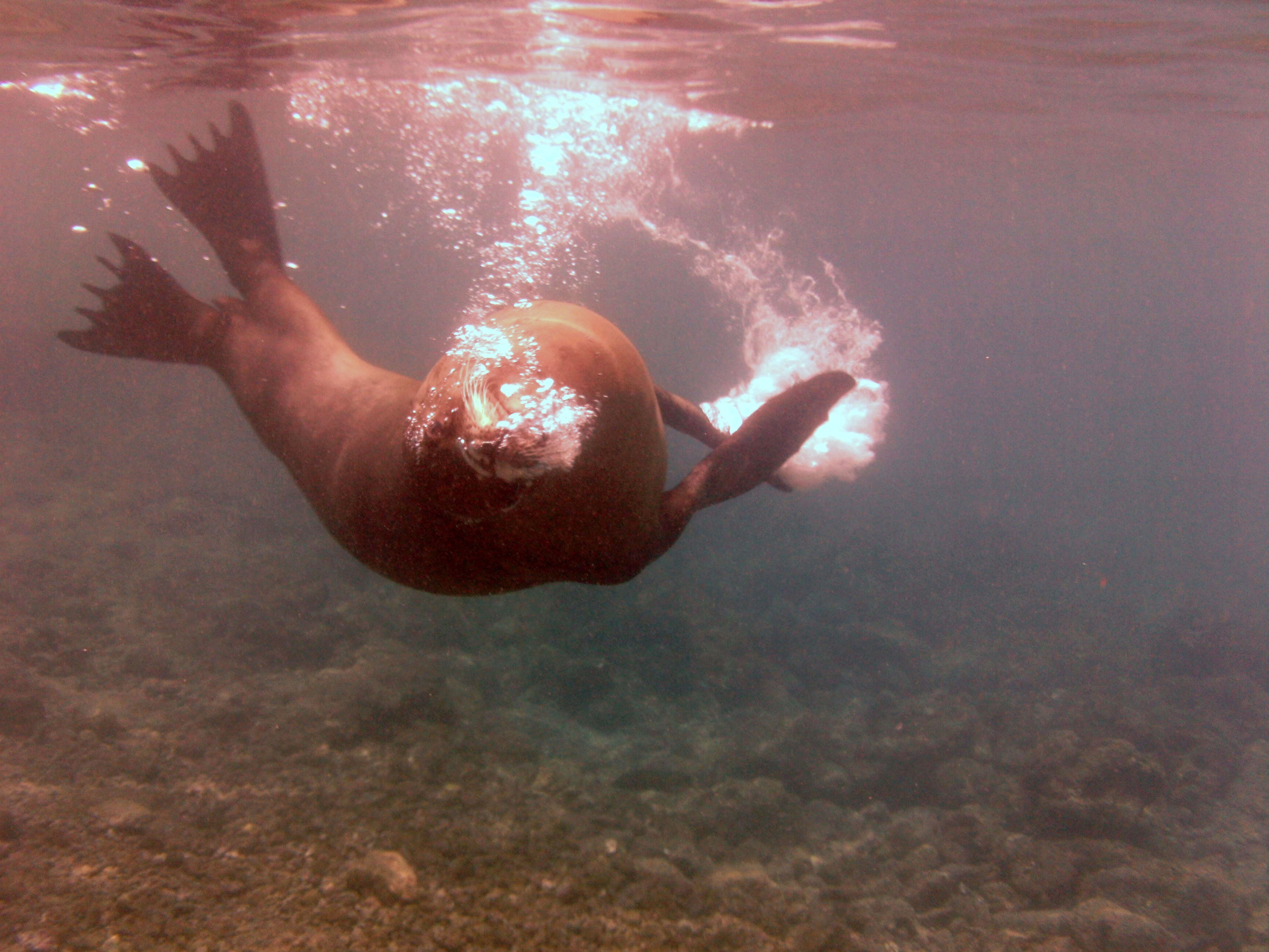 Then out of the shallow blue water a brown face materialized. It looked like the most adorable puppy I had ever seen. It had massive dark eyes and a friendly, curious expression. We made eye contact. As soon as I saw the creature I clapped my hands underwater to capture his interest. It worked and he flew, they don’t swim they fly through the water, straight at my face. I didn’t have the good sense to be afraid of the 200 pound sea creature that was rushing at my head; I was just so happy that he was interacting with me. At the last second he changed direction and with the liquid smoothness of the water itself he swooshed by me. I let out a shout of joy as I turned to see where he went. He smoothly glided in an arc around me. I instinctively understood the rule less game that we were playing. I had played it when I was a child. All that was required was that you fully enjoy and utilize the weightless freedom that the water gave you. I clumsily rolled on my back and looked at my new amphibious friend upside down as he turned back towards me. He immediately recognized the challenge and smoothly rolled onto his back as he gracefully glided towards me. He then twisted and rolled as he shot by me. I responded by doing several flips and a barrel roll. He shot around in a tight circle and then looked at me. I clumsily did what I imagined was the same thing. As I battered and splashed through the water the sea lion moved as if he was part of it. Every part of him from his streamlined face to his wing like flippers and silky coat made him perfectly suited for the marine world.