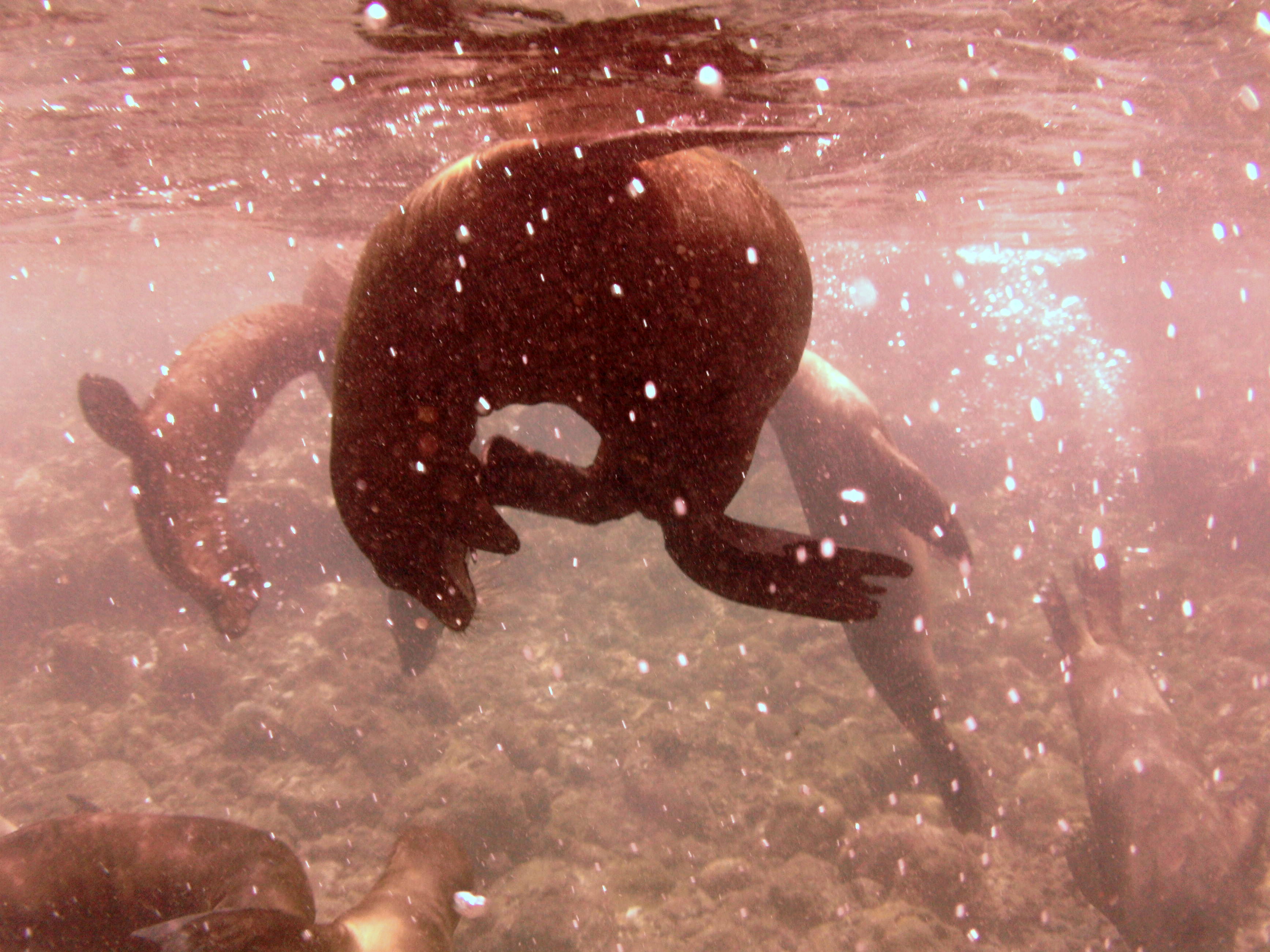 The commotion that my aquatic friend and I created drew the attention of several more sea lions. I could tell that the newcomers were puppies because they were smaller, their coats were darker and if it was possible they were even more adorable than the first sea lion. They also lacked the confidence of my friend and stayed in the shallower water closer to the rocks. They looked at me with intense curiosity and they would get close but didn’t fully play with me like the first one. Instead they created a ball of twisting and twirling puppies in the shallow water. Ever changing as they played with each other, blew bubbles and then stopped and looked at me to see what I was going to do. They were inquisitive but cautious. They wanted so badly to just abandon their fears and completely play with me like the adult but they couldn’t seem to do it so they would come right up to me and look me straight in the face and then shoot back to the shallower water with the other puppies. One of the puppies bellowed into the water and bubbles shot from his mouth with the sound. I replied with what I thought was a relatively authentic sea lion bark into the water. I watched in amazement as one of the puppies curled his body into a crescent so that he could scratch his chin with his hind flipper. I laughed bubbles into the water at the ridiculous feat.