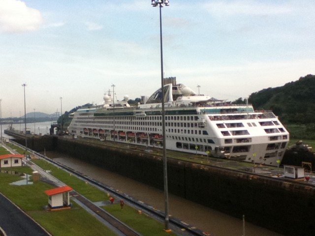 As the taxi turned the corner and drove the last half mile to the canal we saw a massive white cruise ship that looked like it had fallen from the sky and landed in the middle of the jungle. Once we entered the visitor center and climbed to the observation deck we were able to watch the cruise ship lowered in the last lock to sea level and then sail out toward the Pacific. We watched two more ships enter and leave the locks. The whole time they had an announcer who explained in English and Spanish exactly what was happening, what the ships were carrying, where they were coming from and why they were flying certain flags. Later we hit the gift shop, checked out the small but nice museum and then watch a dated but interesting video about the construction of the Canal.