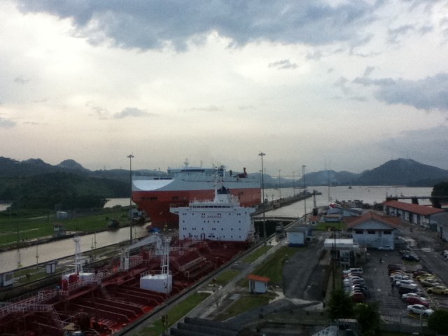 A few things I learned today. The most expensive toll paid by a ship to transit the Canal was $400,000. The toll is based on weight, but there are different ways of assessing the toll for different types of ships. Balboa discovered the Pacific. The French started the canal in 1880 but surrendered after getting a few mosquito bites. The Americans, with the help of a lot of Barbadians, finished the canal in 1914. The massive tankers and container ships only have two feet of space on either side while moving through the locks.